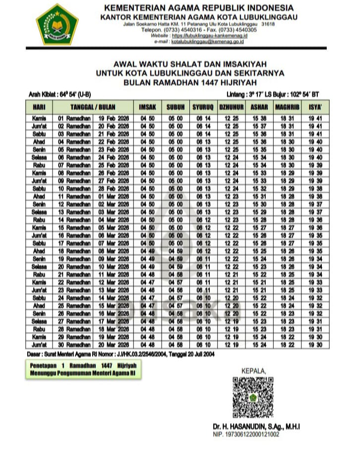 Jadwal Puasa Ramadan 2026 di Lubuk Linggau yang Dikeluarkan Kantor Kementerian Agama