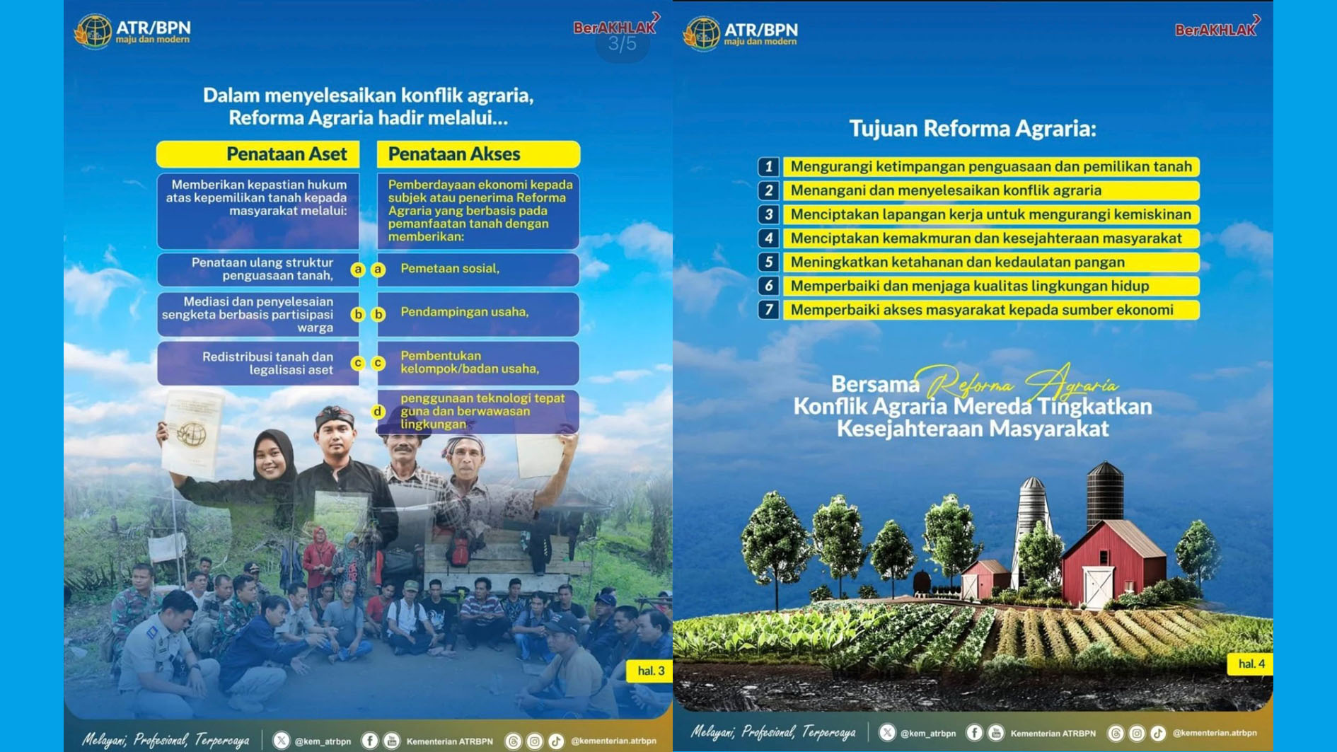 “Dengan Reforma Agraria, konflik tanah yang selama ini menimbulkan ketegangan sosial bisa diubah menjadi kesempatan bagi masyarakat untuk meningkatkan ekonomi dan kesejahteraan,” ujar pihak Kementerian ATR/BPN.
