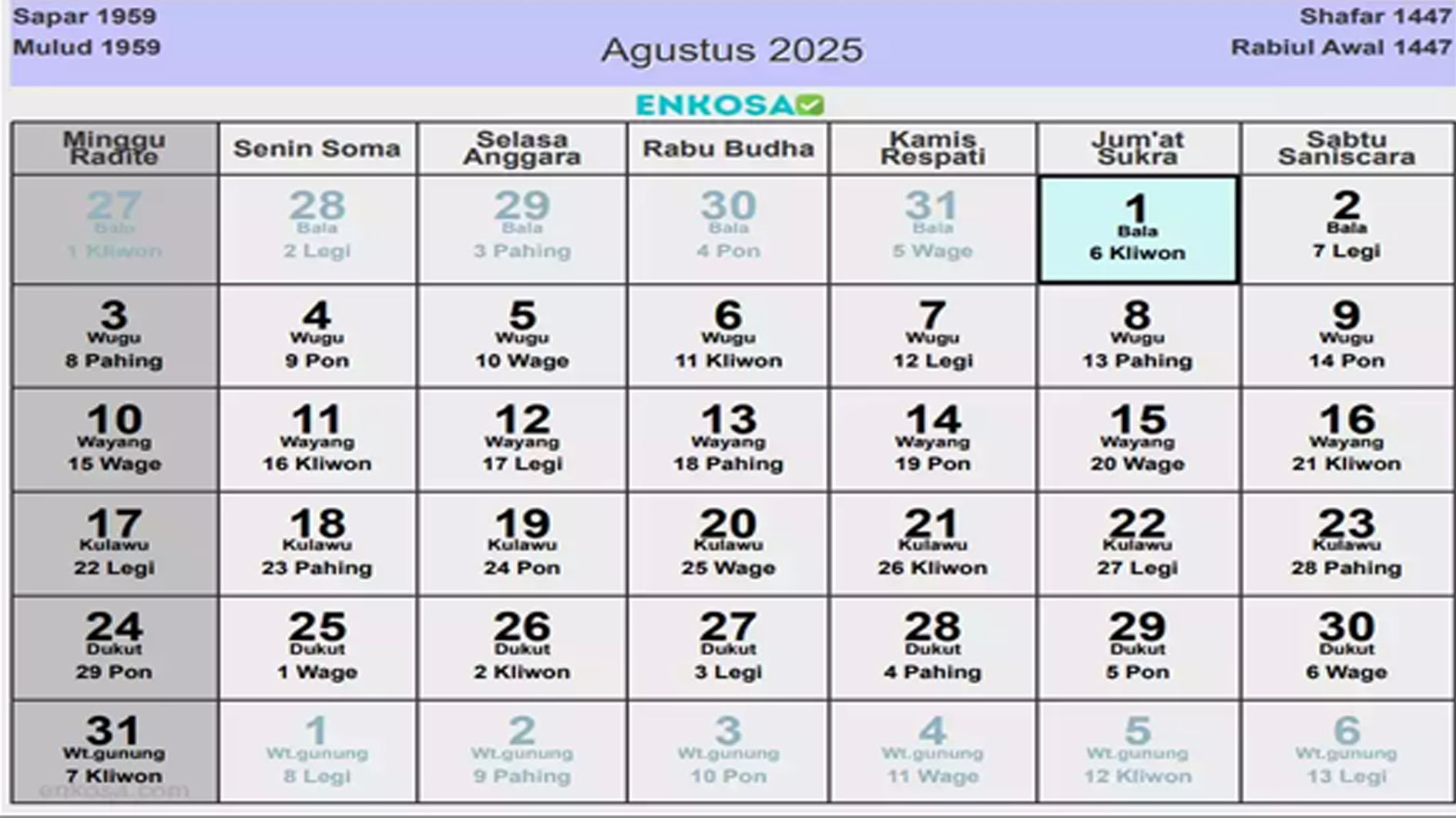 Adapun saat memasuki 1 Agustus 2025, kalender Jawa menunjukkan 6 Sapar 1959, bertepatan dengan Jumat Kliwon.