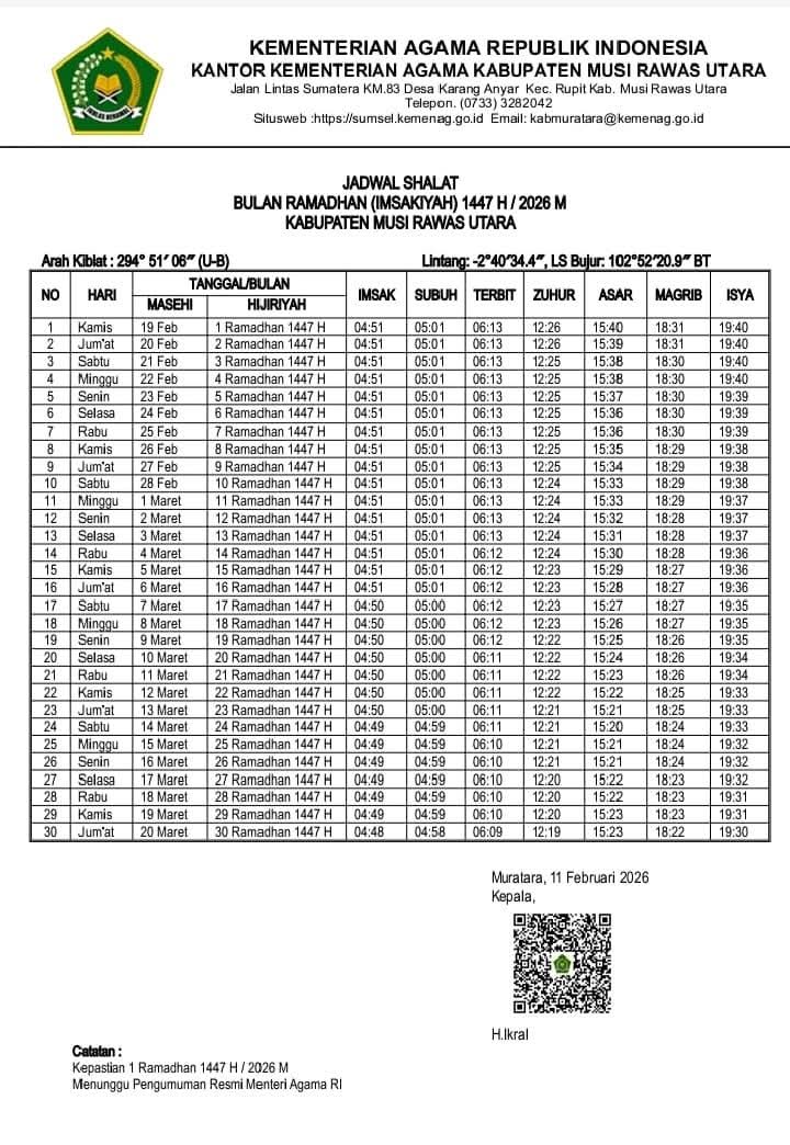 Jadwal tersebut ditandatangani Kepala Kemenag Muratara H Ikral tanggal 11 Februari 2026. Di dalam jadwal tersebut dijelaskan bahwa kepastian 1 Ramadan 1447 H/2026 menunggu pengumuman resmi Menteri Agama RI.