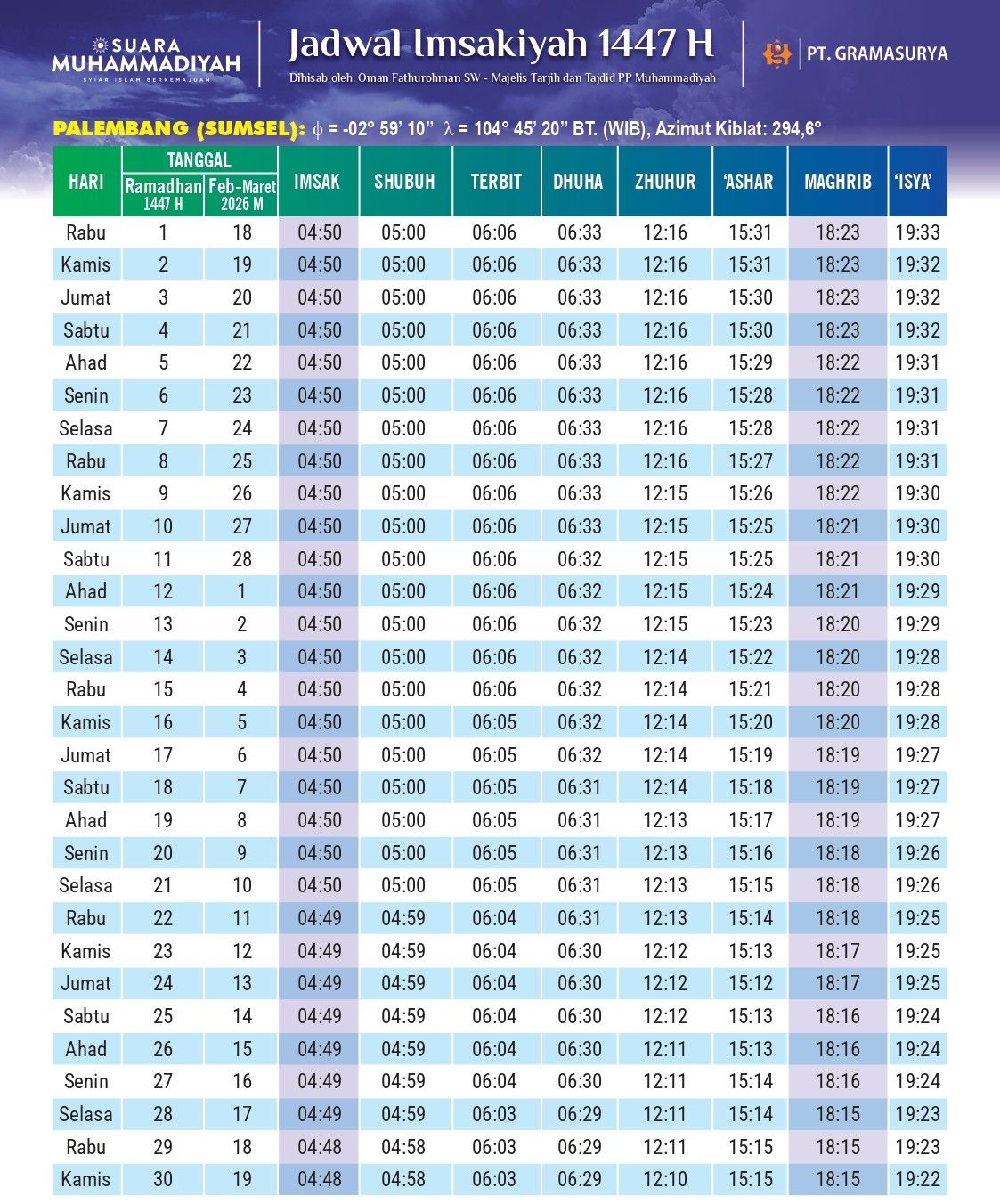 Jadwal Imsakiyah Ramadan 1447 H/2026 Muhammadiyah untuk Palembang --suara muhammadiyah